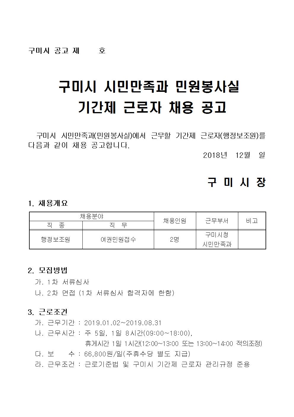 구미시 시민만족과 민원봉사실 기간제근로자 채용 공고