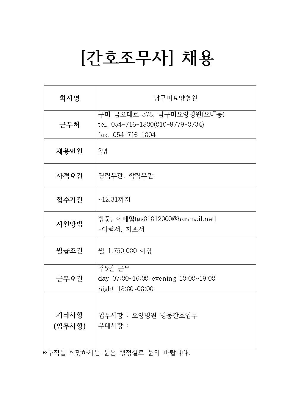 남구미요양병원 채용정보